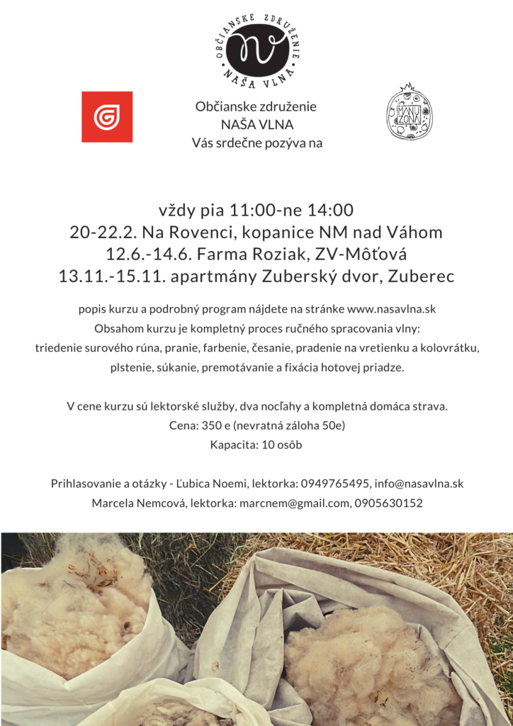 Od roku 2017 organizujeme víkendové kurzy, kde sa venujeme procesu ručného spracovania surového ovčieho rúna od triedenia ostrihanej vlny po ručne upradenú priadzu. Začínali sme v príjemnom domácom prostredí Roziakovskej farmy na Môťovej vo Zvolene, neskôr sme kurzy trochu rozprestreli po ďalších regiónoch, aby bolo pre vás jednoduchšie prísť, takže tie februárové sa konajú na kopaniciach pod Javorinou, júnové vo Zvolene a novembrové v oravskom Zuberci.